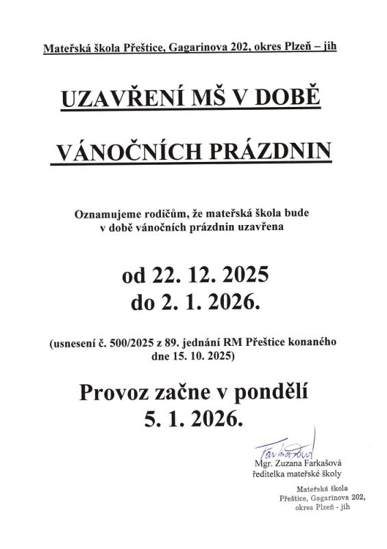 Oznamujeme rodičům, že mateřská škola bude v době vánočních prázdnin uzavřena